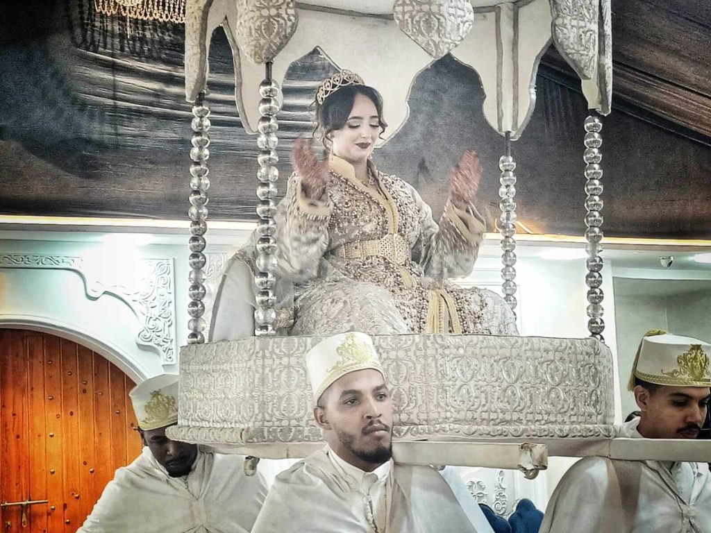 Acompañados por música chaâbi o gnawa, los recién casados avanzan entre aplausos, rodeados de familiares y amigos.